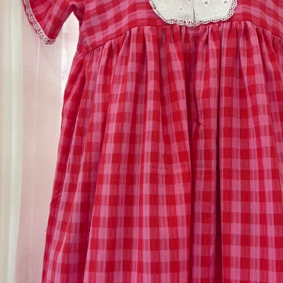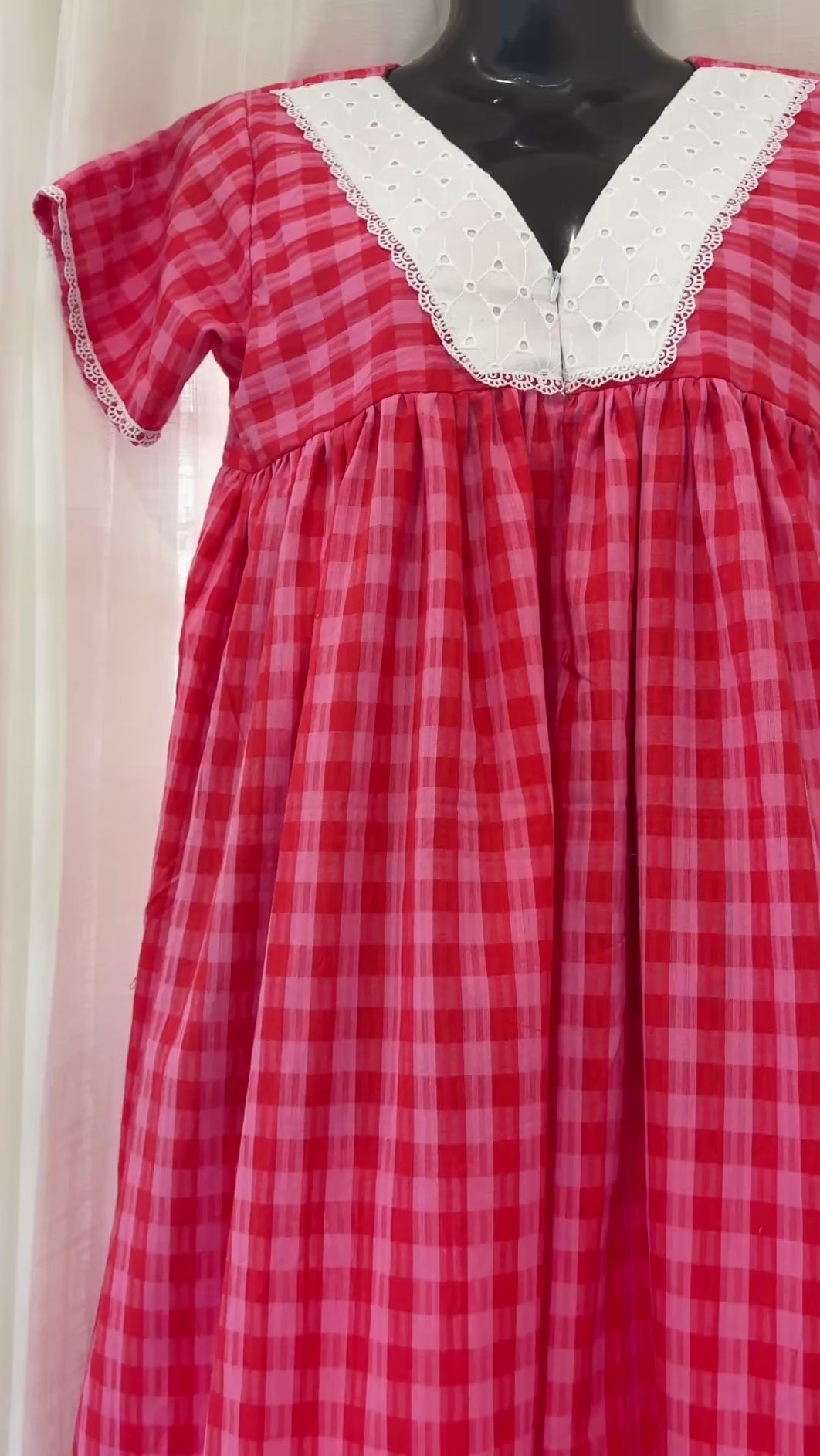 DS85 Dark Pink and Red Seersucker cotton Hakoba V neck dress