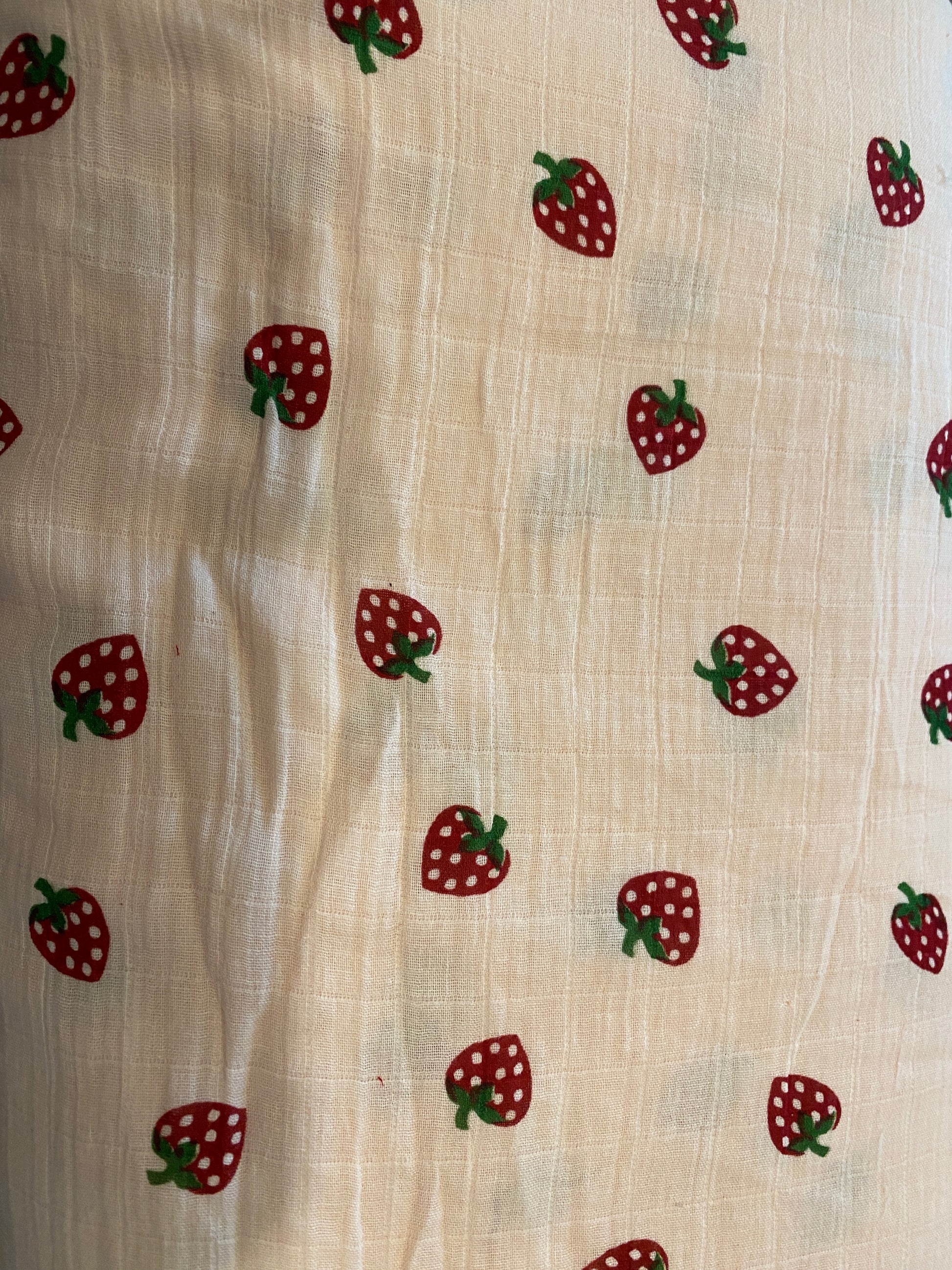 FBR069 Strawberry Print on light peach coloured double gauze muslin fabric